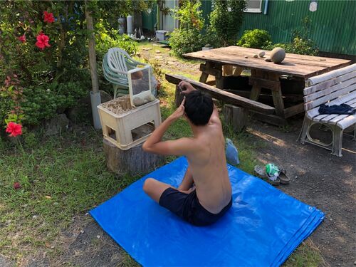 屋久島にいるときは散髪は自分でやったり友達にやってもらったり。 東京での仕事を終え屋久島に帰ってきたまりちゃん。なんとテント泊!ギャップ萌え〜〜 先輩ブルーシーターお手伝い。 これで彼女も立派なブルーシーターだ!! ジュンちゃんが帰ってきた日…